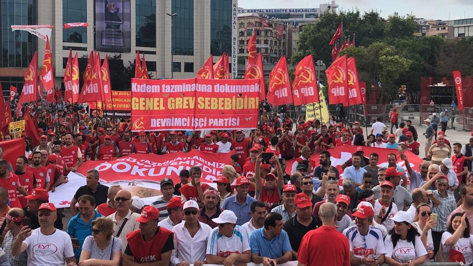 Binlerce DİSK üyesi işçinin yanı sıra sendikalar, meslek örgütleri ve siyasi partilerin de katıldığı eylem saat 17:00’de Kartal Hasan Ali Yücel Kültür Merkezi’nden Kartal Meydanı’na yapılan yürüyüşle başladı. “Kıdem tazminatına dokunmak genel grev sebebidir!” pankartıyla kalabalık bir kortejle eyleme katılan Devrimci İşçi Partisi eylem boyunca ajitasyon ve sloganlarla işçileri sendikalı sendikasız, kadrolu taşeron, yerli göçmen ayrımı yapmadan birleşmeye çağırdı. Krizin faturasını onu yaratanlara ödetmenin, istibdada karşı hürriyet mücadelesini başarıya ulaştırmanın yolunun birleşik işçi cephesi olduğunu belirtti.