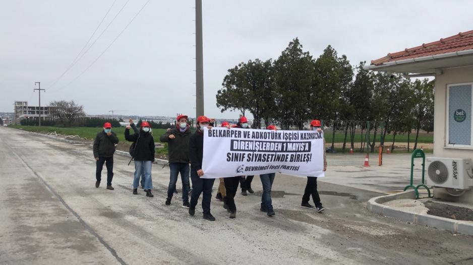 Devrimci İşçi Partisi olarak her iki mücadelenin de ilk gününden beri yanındayız. Ekmek ve hürriyetine sahip çıkan işçilerin haklı davasına destek oluyor ve herkesi bu haklı mücadelelere omuz vermeye çağırıyoruz. Bugün de DİP, 1 Mayıs’a giderken, her bir fabrikanın, işyerinin ama en çok da direniş alanlarının 1 Mayıs çağrısının yükseleceği mevziler olmasından hareketle, her iki fabrikada devam eden direniş alanlarındaydı. “Belkarper ve Adkoturk işçisi kazanacak! Direnişlerden 1Mayıs’a sınıf siyasetinde birleş!” pankartıyla ve sloganlarla direniş alanlarına yürüdü, direniş alanında işçilerle sohbet ettik. Adkoturk’te vardiya servisleri girerken alkışlarla, sloganlarla sendikasına sahip çıkan işçilerin sesine sesini kattı.