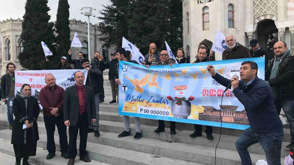 22 Aralık Pazar günü çeşitli sektörlerden çalışanlar, Asgari Ücret Tespit Komisyonu'nun işleyişini teşhir etmek için Beyazıt Meydanı’ndaydı. İşçi İttifakı adıyla toplanan işçiler, basın açıklamasından önce bir mizansen gerçekleştirerek, her sene sonu hükümet-patron-sendika üçlüsünün bir araya gelerek görüştüğü ama her seferinde işçinin değil patronun istediği asgari ücretin belirlendiği komisyonu konu aldılar.