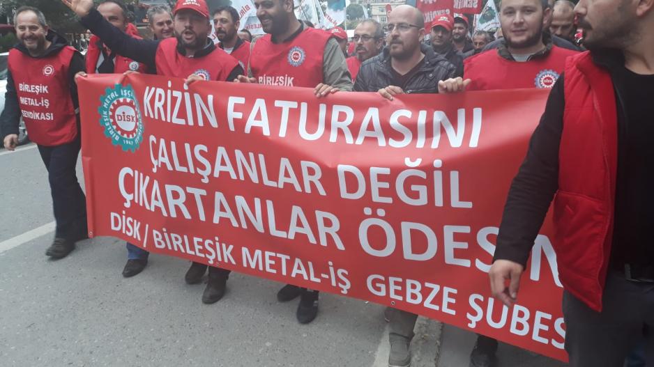Gebze Sendikalar Birliği’nin çağrısı ile yüzlerce işçi Gebze Kent Meydanı’na yürüyerek ekonomik krizin faturasının işçi sınıfına kesilmesine karşı çıktı. Eylemin en önemli yönü, farklı konfederasyonlardan sendikalara üye işçilerin omuz omuza meydana çıkmasıydı. Türk-İş’e bağlı Petrol-İş sendikası, DİSK’e bağlı Birleşik Metal-İş, Nakliyat-İş ve Lastik-İş sendikaları ve Hak-İş’e bağlı Çelik-İş sendikası üyesi işçiler hep bir ağızdan “kurtuluş yok tek başına ya hep beraber ya hiçbirimiz” sloganları attılar.