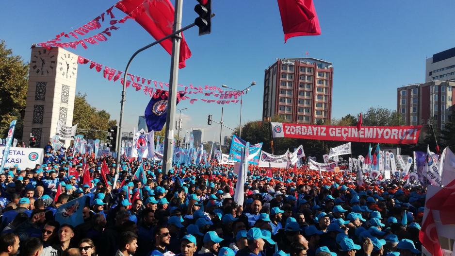 Türk-İş 20 Ekim’de, Ankara Tandoğan meydanında “Zordayız Geçinemiyoruz” başlığı ile ve 100 bine yakın işçinin katılımıyla büyük bir miting gerçekleştirdi. Direnişleri süren Polonez işçileri Tekgıda-İş, grevde olan MKB Rondo işçileri Selüloz-İş, yine grevleri sürmekte olan As Plastik, Elba Bant, Tarkett işçileri de Petrol-İş saflarında alanda temsil edildiler. Özellikle Polonez işçileri fabrika önündeki direnişlerinin coşkusunu Ankara’ya taşıdılar. Polonez işçilerinin boykot çağrısı ve talepleri hem Ergün Atalay’ın konuşmasında hem de pankart açılarak miting kürsüsünde ifade edildi. Türk-İş Başkanı Ergün Atalay, miting kürsüsünden işçi sınıfının en yakıcı sorunları olan hayat pahalılığı, vergide adalet talebi ve sendikal örgütlenme önündeki engelleri gündeme getirdi. Devrimci İşçi Partisi de bu mitinge “İşçi düşmanı OVP çöpe! İngiliz Mehmet Go Home!” ve “Esnek çalışma dayatması ve kıdem tazminatı hakkının gaspı genel grev sebebidir!” pankartlarıyla katıldı.