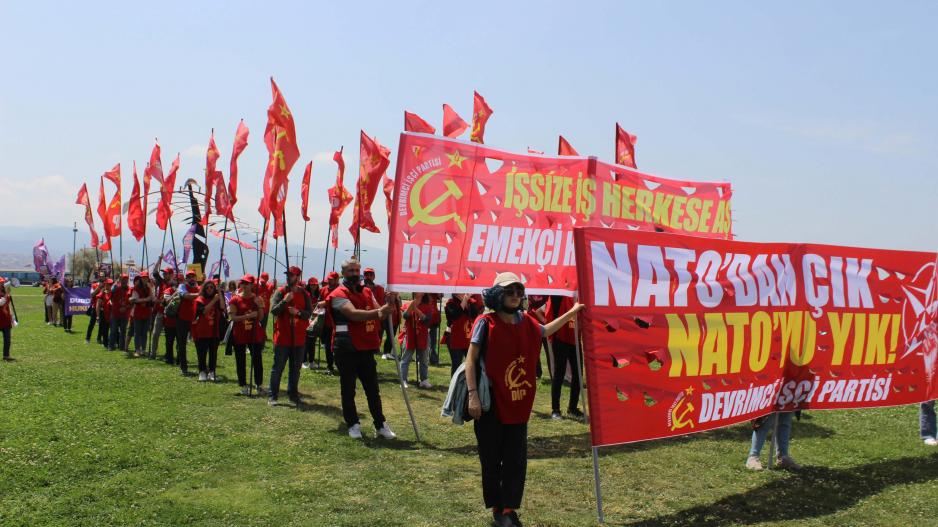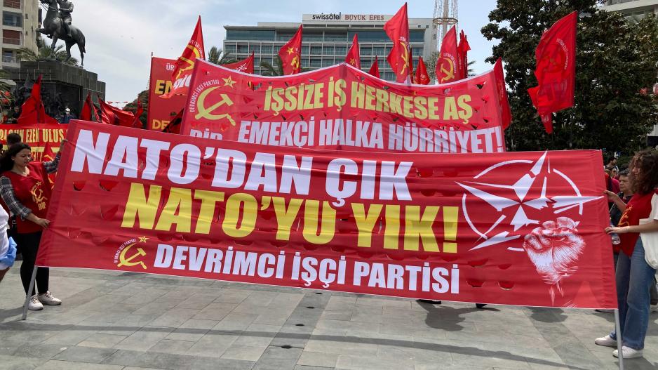 Devrimci İşçi Partisi, taşıdığı diğer pankart ile dünyada işçi sınıfı ve mazlum halkların baş düşmanı olan NATO’nun ülkemizde ve bölgemizdeki varlığını lanetledi. Türkiye işçi sınıfının da kanlısı olan emperyalizmin bu terör örgütünden derhâl çıkılması, hatta yıkılması için “NATO’dan çık, NATO’yu yık!” yazılı pankart ile tüm emekçileri mücadeleye çağırdı.