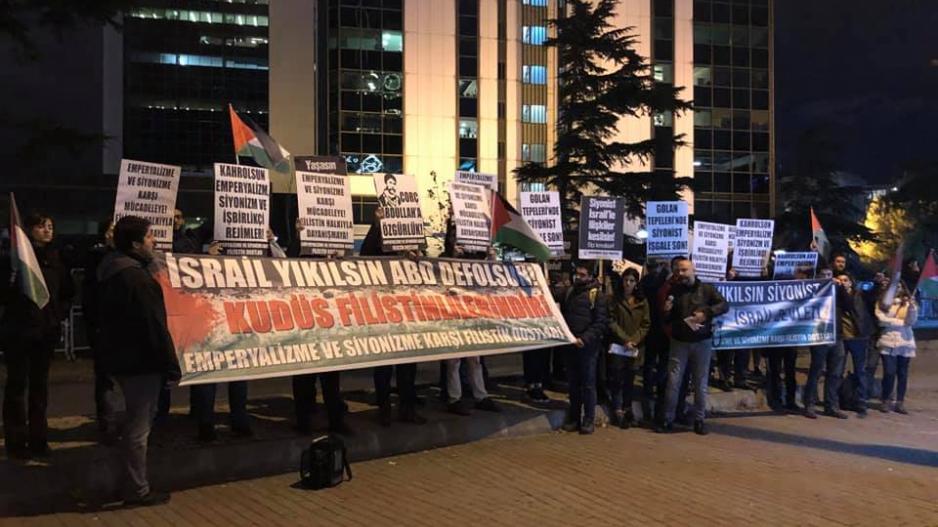 Levent'te bir araya gelen Filistin dostları, “'Yıkılsın Siyonist İsrail devleti” yazılı pankartın arkasında, Filistin bayraklarıyla konsolosluk önüne yürüdü. Filistin dostları eylem boyunca “Yıkılsın Siyonist İsrail devleti!”, “Nehirden denize özgür Filistin!”, “Kahrolsun ABD emperyalizmi!”, “Katil ABD Ortadoğu’dan defol!”, “Kahrolsun Avrupa emperyalizmi!” sloganlarını attı. Konsolosluk önünde “ABD defol! Kudüs Filistinlilerindir!” pankartı açan Filistin dostları “Elçi defolsun, ilişkiler kesilsin!” sloganıyla Filistinlilerin Siyonist İsrail ile ilişkilerinin kesilmesi talebini yükseltti.